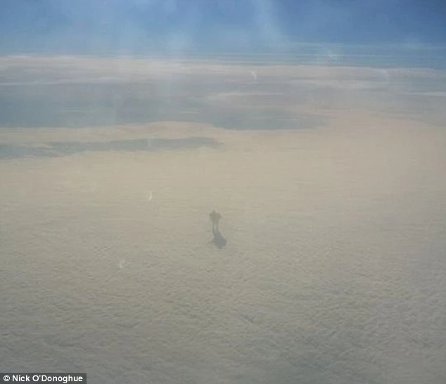 I was flying back from a work ski trip in Austria, I was on the window seat with two work colleges beside me. They were talking like crazy and I was gazing out the window, as you do. I could see this figure in the distance in front of us and then as we flew closer this shape appeared. I asked the ladies beside me to look at it too in case I was seeing things. They too were amazed! I then took some pictures and then the aircraft slowly passed it. It was in view for about two minutes as it was a good bit away in the distance. To me it looked like the Michelin man but to be honest I have no idea what it was. Some comments online said it was smoke stacks below and the heat from them pushed up the layer of clouds, but I don't think so as they looked very close together. Probably just a funky cloud formation but I'd love for someone who knows about clouds to see it and try and explain. - Nick O'Donoghue [sic] (dailymail.co.uk)