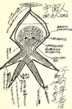This creature, described as resembling an octopoid or starfish-man, had toad-like skin with colorful scabs and wore a transparent vinyl space suit emitting strange gleams. It communicated telepathically with Fujiwara and took him aboard a large disk-shaped flying saucer. Inside the saucer, Fujiwara observed more of these alien beings and was eventually released close to his home.